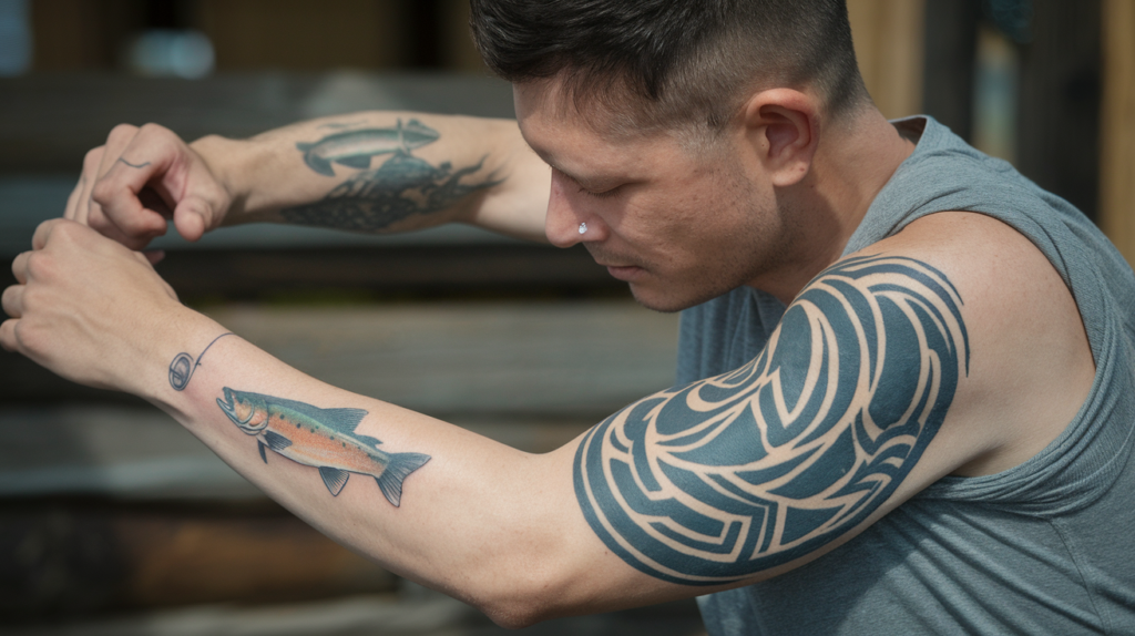 A flyfishing tattoo represents a strong connection to nature, emphasizing traits such as patience, skill, and the spiritual aspects of the activity.