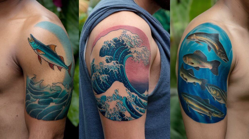 These tattoos frequently represent fish, particularly popular fly-fishing species such as trout and salmon. They frequently exhibit movement, such as swimming, jumping out of the water, or gliding beneath the surface. Water has an important role in fly fishing tattoos.